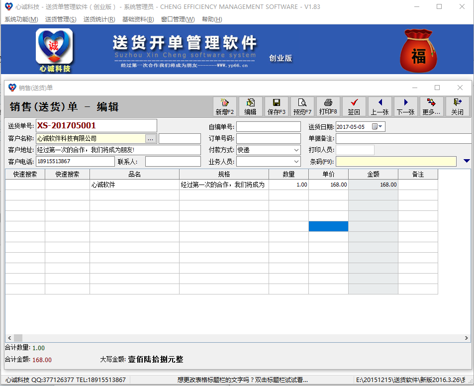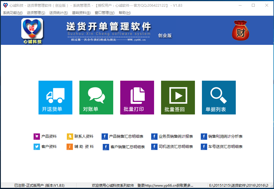 心诚送货单管理软件创业版。软件界面简洁、功能强大、操作简便,不仅集成了送货单管理、产品管理、客户管理、产品资料库、客户资料库、职员资料库、辅助资料管理对账单等常见的送货单管理功能。