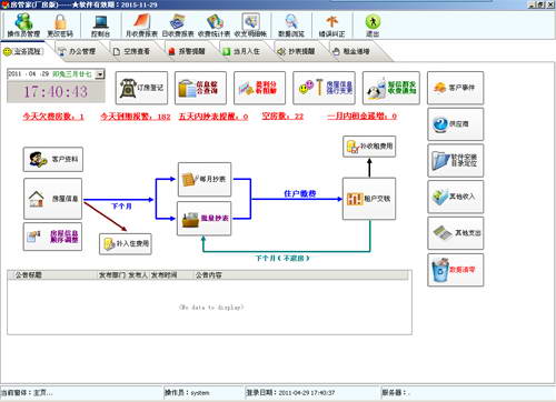 4、具有抄表报警、欠费报警、合同到期报警、租金递增报警、空房查看等。