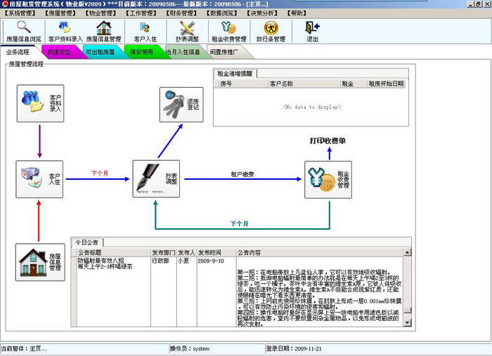 易用性:软件充分考虑到用户的电脑专业性能问题,尽量达到傻瓜化,经过多年的研发,只要会上网基本就会用,复杂的地方,尽量做到智能化,每月用户只需输入水电表刻度,则系统会自动计算每个房间应收租金水电及其他费用,并且打印收费单以做收费凭据。