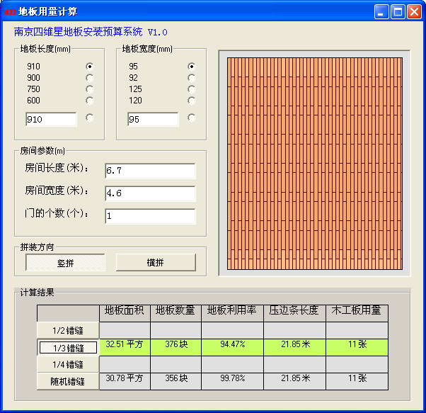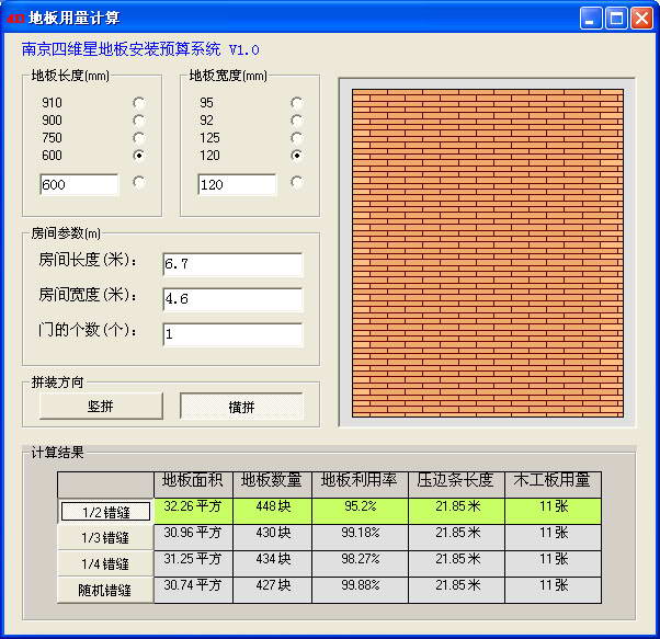 1楼 华军网友 2021-12-31 20:20:13四维星地板铺装用量计算软件很好用,谢谢啦!!