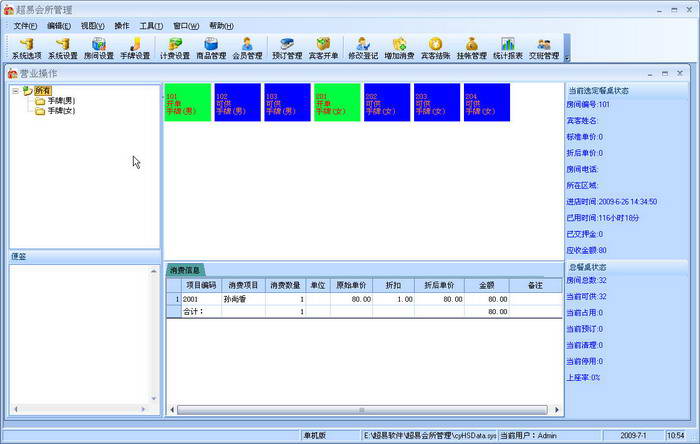 超易会所管理系统是一款专业的会所管理软件,是目前市面上性价比最高,最好的会所管理系统,支持手牌管理、支持房间管理、技师排班管理、服务生状态管理、独立的商品管理、包间预订管理、钟点房和全天房管理、支持会员积分卡、计次卡和储值卡管理。商品资料管理,支持商品采购管理,库存查询管理等。系统界面简洁优美,操作直观简单,无需专门培训即可正常使用。超易会所管理系统为会所制企业经营者提供了成本分析,利润分析,物流管理等诸多功能,能广泛适用休闲娱乐中心,酒店宾馆,洗浴桑拿等会所制企业实现管理信息化理想的会所管理系统软件。软件提供了方便的数据查询功能,也可将各类数据转化为Excel文档 报表统计及打印 系统设置等功能。