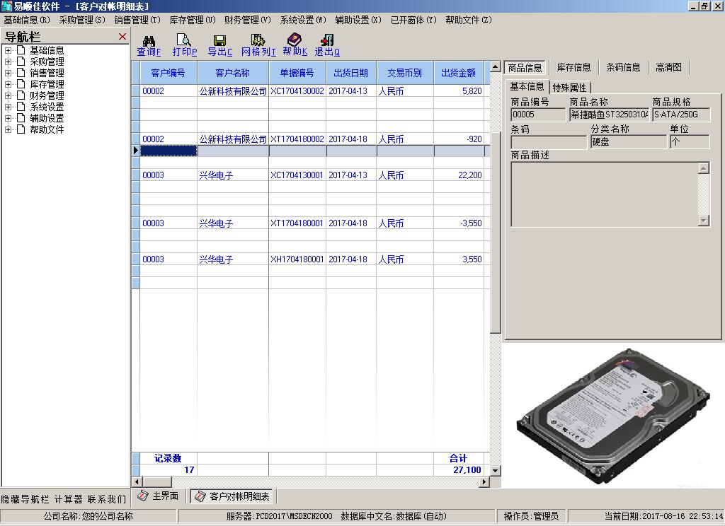 2、基础信息:提供多项基本的信息设置,包括:人员信息/部门信息/往来单位信息/地区信息/行业信息/结帐方式/币别与汇率/往来单位来源/往来单位分类/商品信息/商品分类信息/商品单位信息/条码信息/仓库信息/支付方式/帐户信息等信息。部门信息/地区信息/行业信息/往来单位分类/商品分类信息等按树型结构进行分类管理,让您以后可以按大小类进行数据查询分析。在商品信息界面中可以同时录入商品对应的多个客户与供应商,让您随时可以查询出每种商品的详细客户与供应商,不同的客户/供应商可以设置不同的交易单位/单价/料号。强大的商品图片管理功能,一个商品可以存放1张默认图与18张高清图,可以设置图片存放在本机上,还是数据库上,还是存放图片面性网址,导出Excel时,支持连商品图片也一起导出到Excel里面。直接可以在商品信息中查看每种商品在每一个仓库的详细数量。人员/往来单位(包括供应商、客户、会员等)/商品信息的批量数据导入功能,让您一次性完成前期数据的建立。人员分部门,往来单位(包括供应商、客户、会员等)分行业分地区,商品分类管理,让您更加方便进行人员/往来单位(包括供应商、客户、会员等)/商品信息管理。