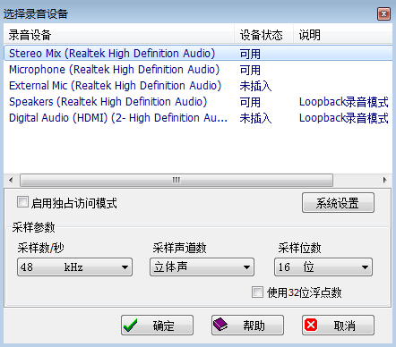 5.录音设备选择 选择枚举到的录音设备并进行采样参数设置,支持8、16、24、32位采样,可以选择以独占或共享模式使用录音设备。