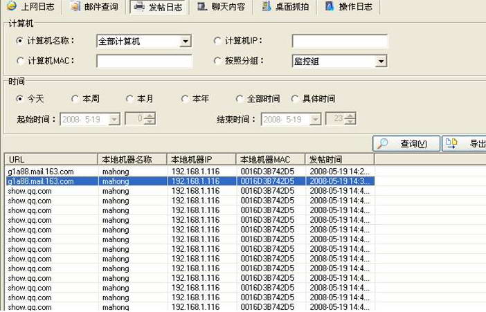 6)查询统计功能:系统提供针对监控对象的各种上网日志以及操作日志的查询功能,并以曲线、报表、图表等方式为工作分析提供统计结果。