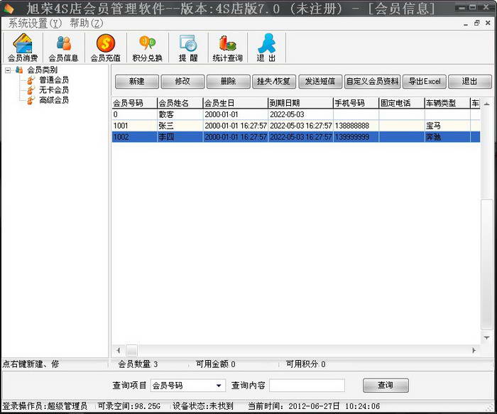 专业开发销售汽车4S店会员管理系统,软件实现智能添加编辑自己的服务项目,对各个项目实行不同会员类别的积分率和折扣率的设定!优惠卷、现金劵、的使用,积分可以直接兑换成金额消费!有各种到期发短信提醒功能!