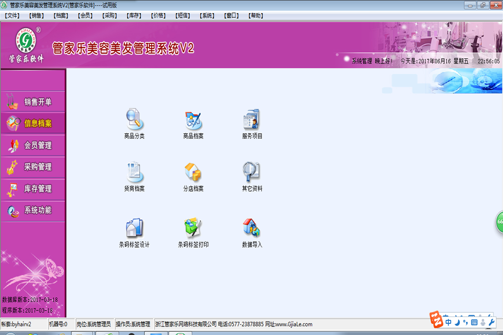 用于初始化、管理及维护软件的基本资料信息。主要包含有:商品分类、商品项目、服务项目、货商档案、会员单位资料、分店档案、其它资料以及数据导入等功能模块。